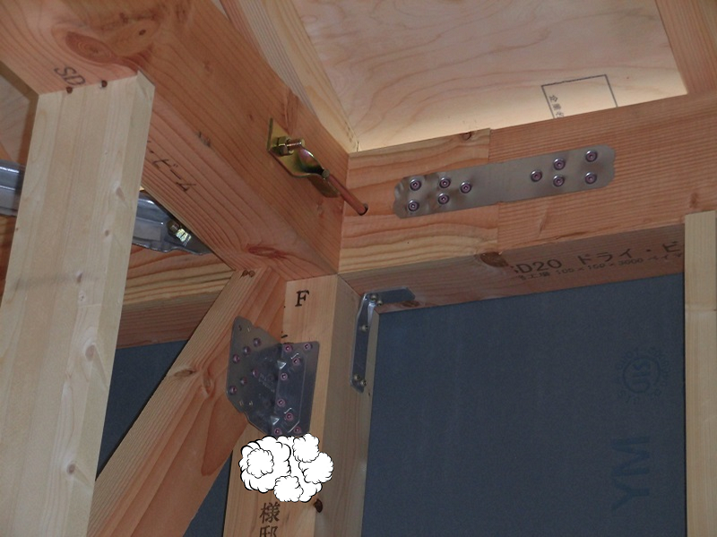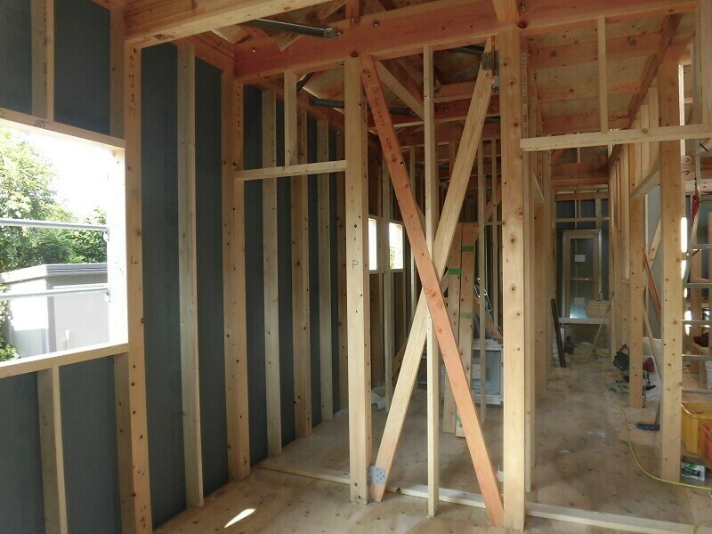 耐震上で必要となる筋交いや、間仕切壁の柱間の設置される間柱、建具上に付くまぐさ等、プレカットして現場納入された部材の取付作業も完了し、金物類も全て付け終えることが出来ました。