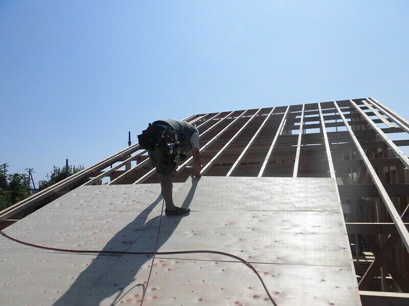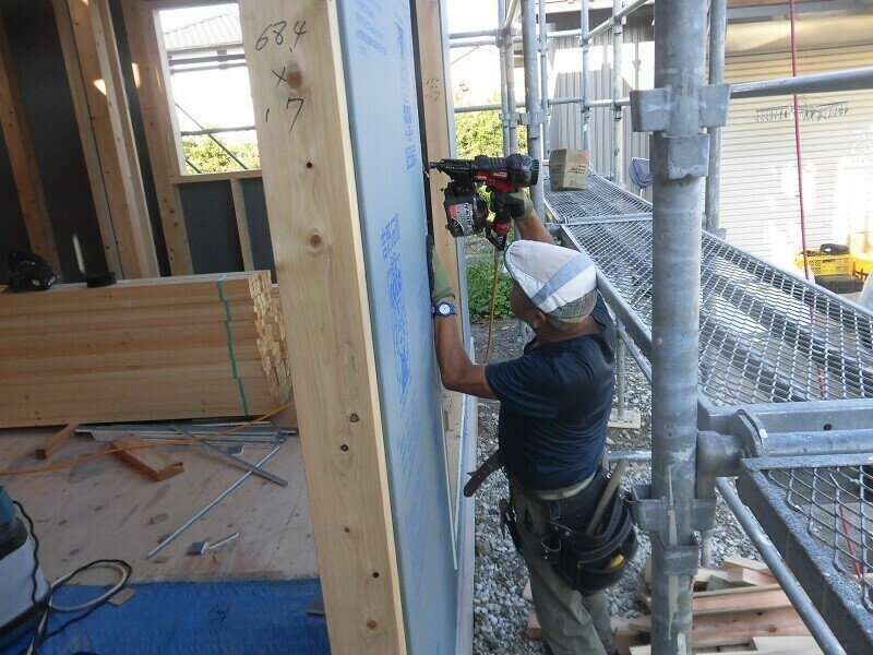 一時的に濡れてしまうのは仕方が無いにしても、雨に濡れてしまう状況を放置しておくのはやはり良くないので、2日目は耐力面材となる『EXハイパー』を張る作業を行うようにしています。