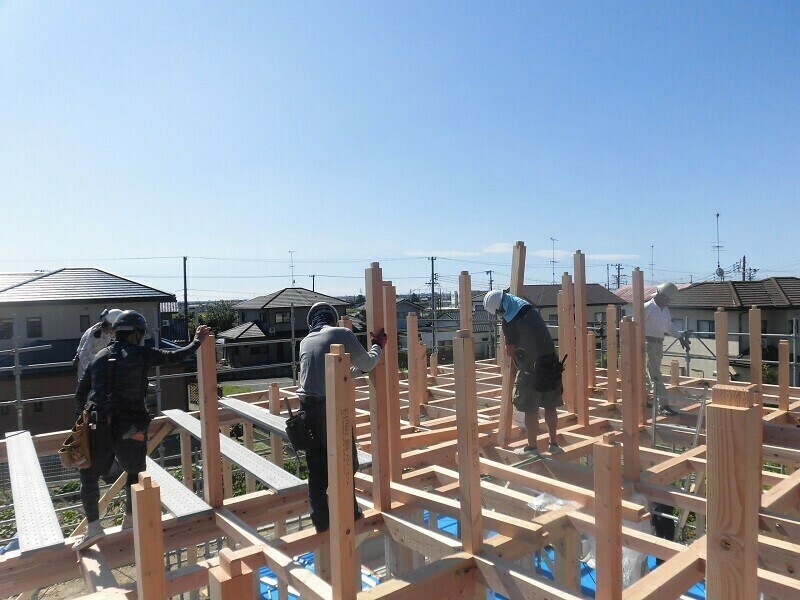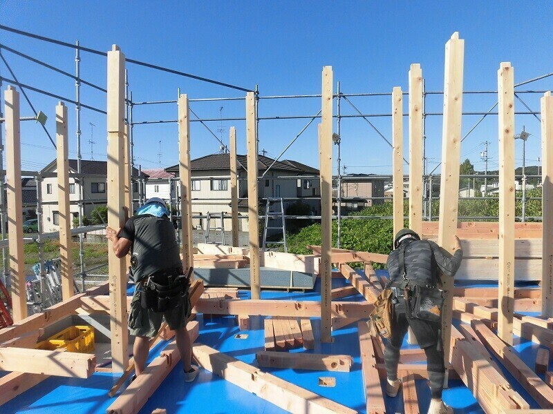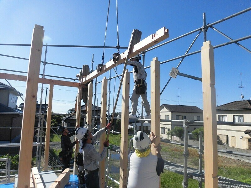 上棟日には柱や梁などの建物の基本構造となる部分の組み立て作業を大工さん数人掛かりで行います。