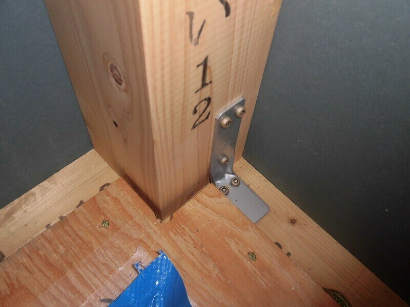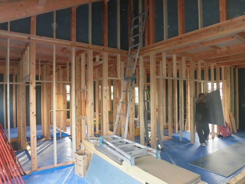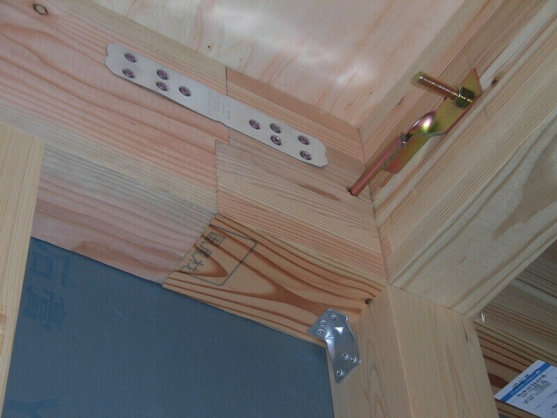 さて・・・ここまで柱を立てていくところから耐力面材を張るところまで主に外部の様子をレポートしてきましたが、内部は内部で並行して作業をしており、筋交い、間柱、まぐさ等の設置と、筋交いプレート、ハイパースリム、リブコーナー等の耐震金物の取付が完了しました。