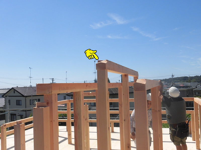 棟木というのは屋根の一番高いところに横たわって配置される木材のことを言い、S様邸の場合、画像の矢印部分の木がそれに当たります。