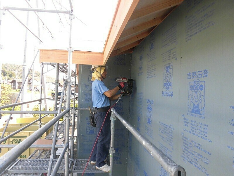 一時的に濡れてしまうのは仕方が無いにしても、雨に濡れてしまう状況を1週間も2週間も放置しておくのはやはり良くないので、2日目は耐力面材となる『EXハイパー』を張る作業を行うようにしています。