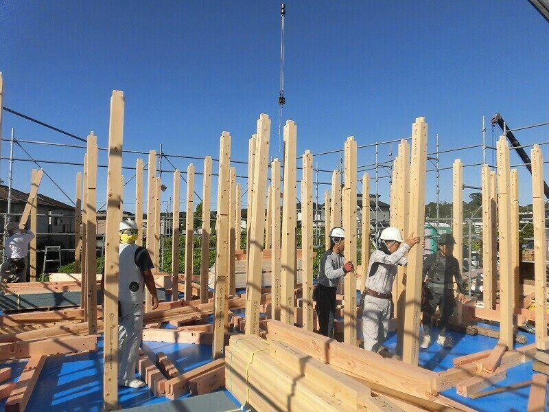 写真の中の無数に立っている木材・・・背丈を超えるようなものもあるので『柱』と思われがちですが、これらはすべて屋根を支えるもので、1・2階の階層を支える柱と区別して『小屋束』と呼んでいます。