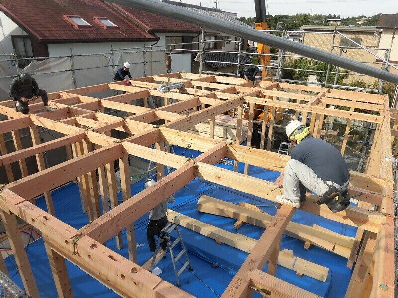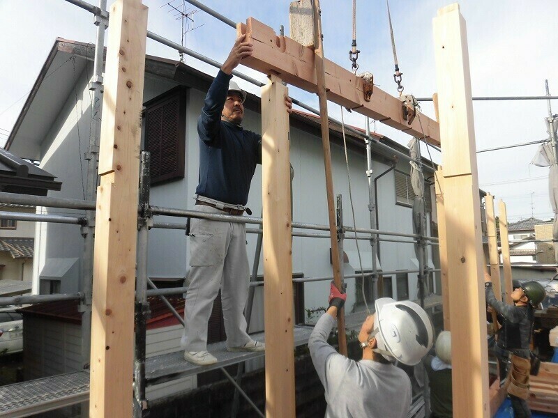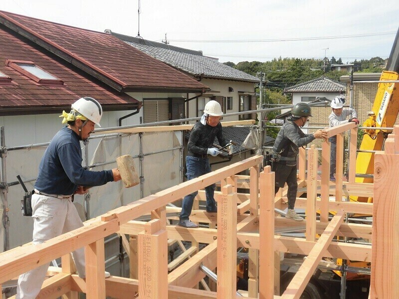 上棟日には柱や梁などの建物の基本構造となる部分の組み立て作業を大工さん数人掛かりで行います。