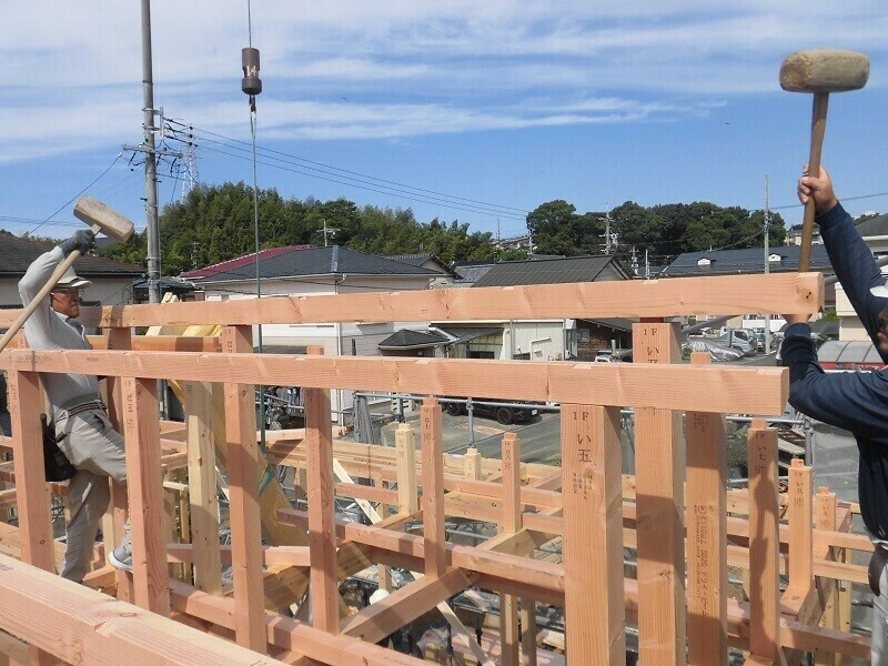 2階建ての家の場合、1階の梁を組んだら2階床→2階柱→2階梁・・・という手順を踏んでいきますが、平屋の場合は1階の梁の上に小屋束を立てて、小屋束のほぞを母屋のほぞ穴に差し込んでいきます。