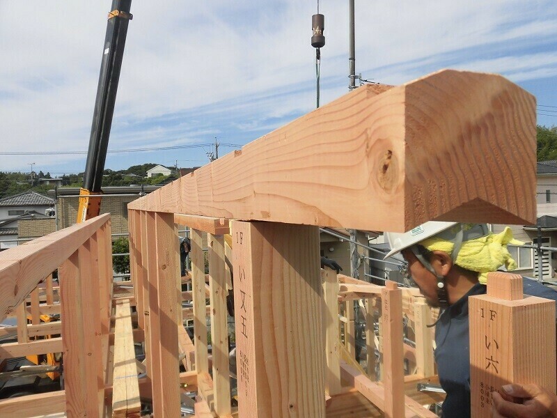 レッカー屋さんと連携を取りながら柱のほぞを梁のほぞ穴にはめ込んでいきます。