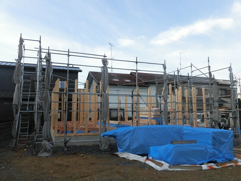 天気の具合にもよりますが、この日は前日も晴れていたので、先行して大工さんに柱を立てておいてもらいました。