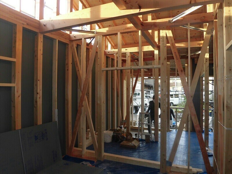 建物内部の方もいつもは間柱・窓台・まぐさのほとんどを設置し終えますが、今回は筋交いを優先で設置し、その他の部材の取付が若干残ったところで時間となりました。