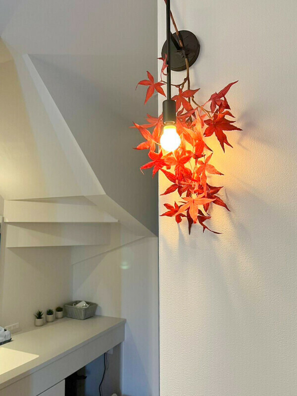 玄関ホールのブラケット照明には、もみじが飾られていました。照明にライトアップされたもみじがきれいです。