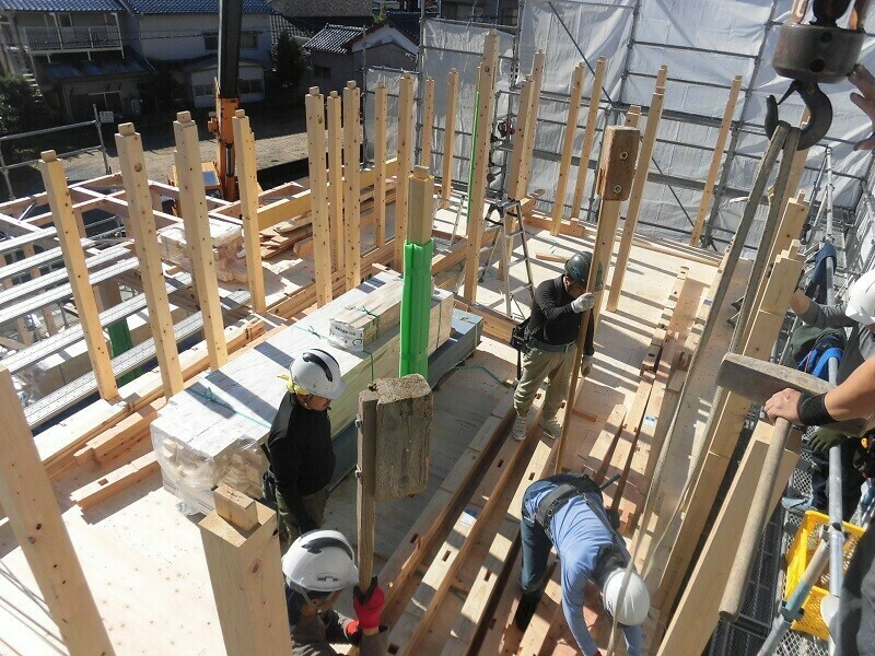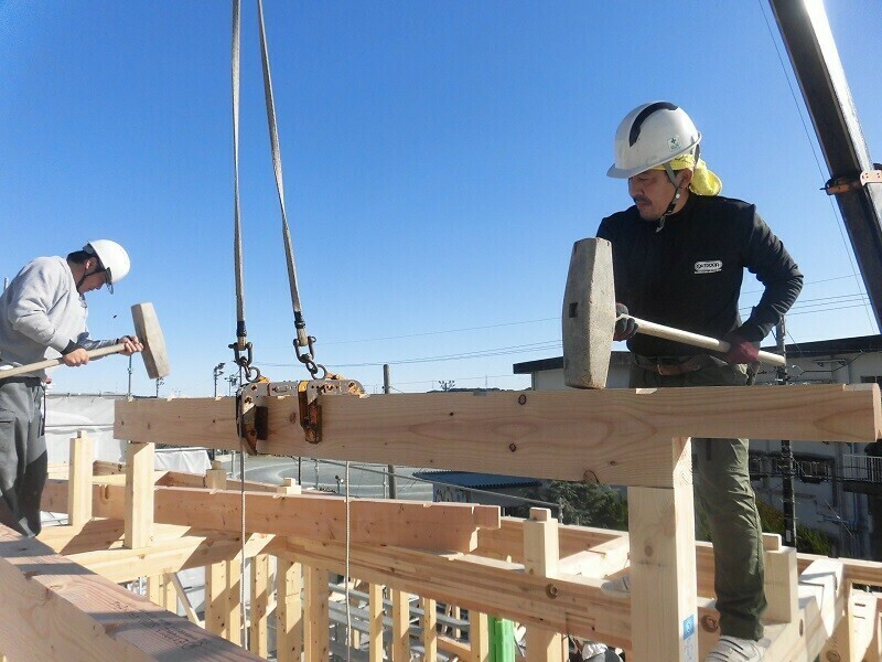 上棟日には柱や梁などの建物の基本構造となる部分の組み立て作業を大工さん数人掛かりで行います。