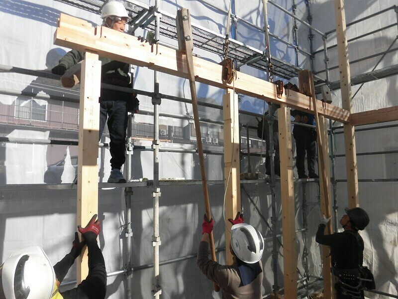 柱を立て終えると、レッカー屋さんと連携を取りながら柱のほぞを梁のほぞ穴にはめ込んでいきます。