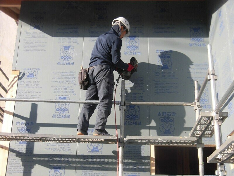 このEXハイパーですが、施工手順としてはまず寸法通りにカットして、それを外に運び出し、所定の位置に仮留めしたものを仕上げに釘打ち機で固定するという手順となります。