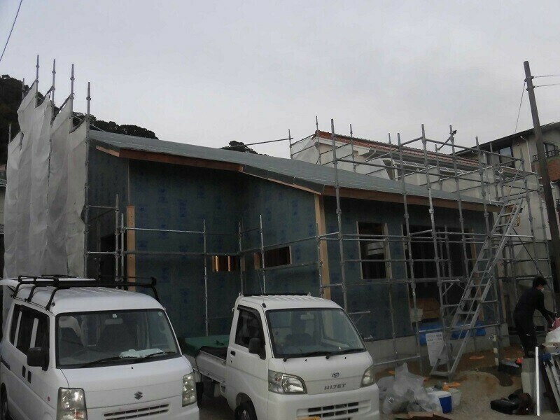 ・・・というわけで、棟が上がったは、母屋に垂木を打ち、更に屋根の合板を敷くところまで進めて、ここで1日目の作業は終了です。