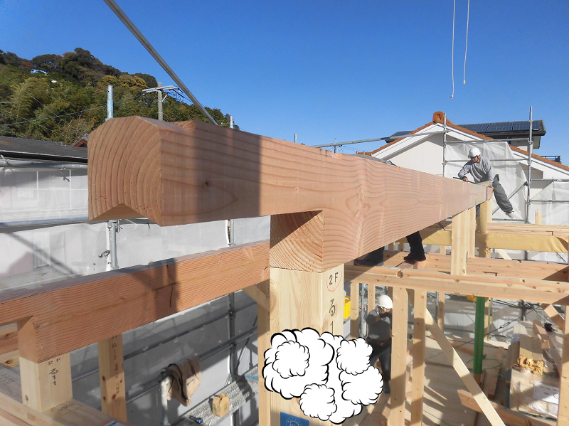 棟木というのは屋根の一番高いところに横たわって配置される木材のことを言い、O様邸の場合、画像の矢印部分の木がそれに当たります。
