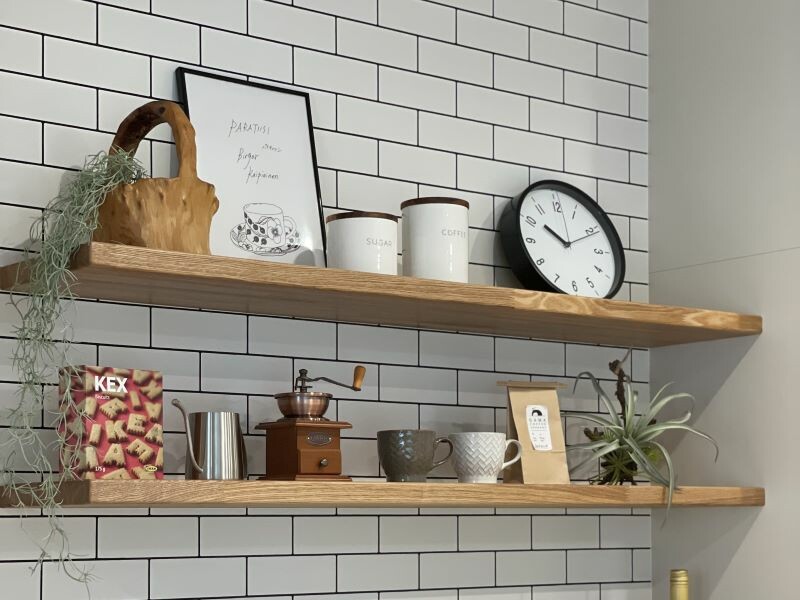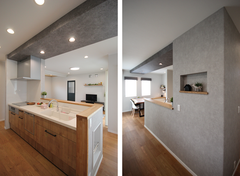 手元隠しの壁をアクセントクロスにするだけでは物足りないときは、積層カウンターを組み合わせて対面側を家具調の仕上がりにしてみたり、本棚造作や飾り棚を設けてみたりするなど、オシャレに見せる方法は幅広くあります。