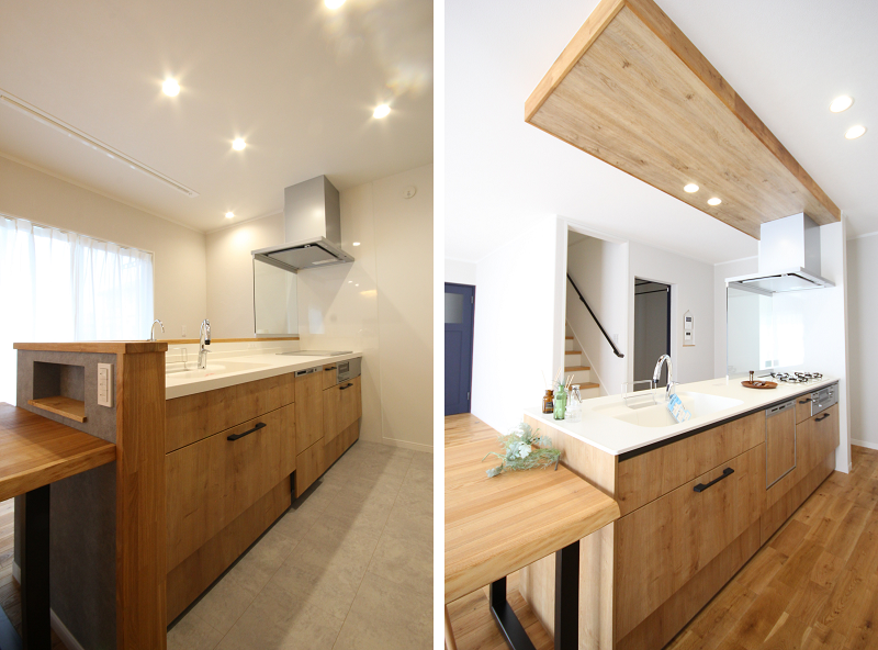 立ち上がりの壁があって手元が隠れるような仕様の左側のキッチンに対し、右側のキッチンは完全にオープンのフルフラットの天板となっています。