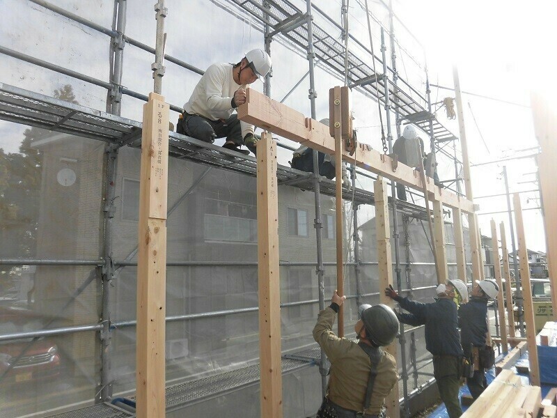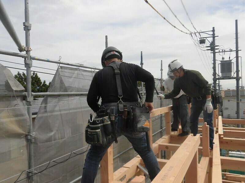 上棟日には柱や梁などの建物の基本構造となる部分の組み立て作業を大工さん数人掛かりで行います。