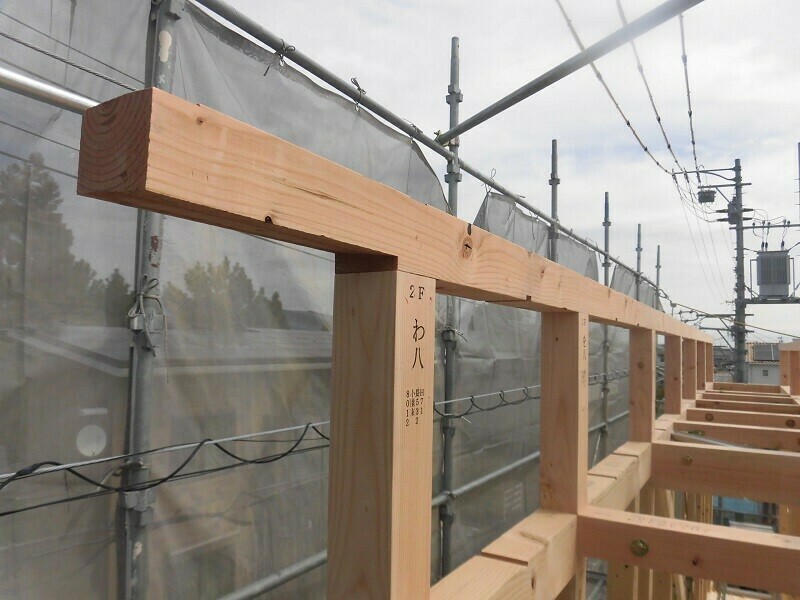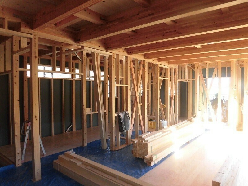耐震上で必要となる筋交いや、間仕切壁の柱間の設置される間柱、建具上に付くまぐさ等、プレカットして現場納入された部材の取付作業を行い、こちらも全ての部材の取付が完了。
