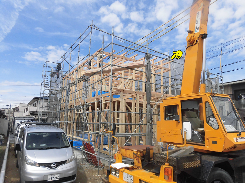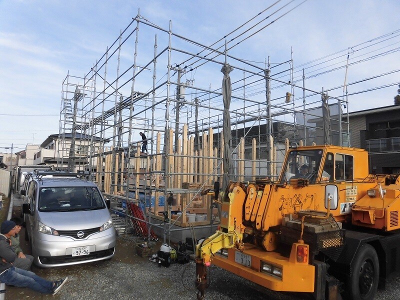 レッカー屋さんと連携を取りながら柱のほぞを梁のほぞ穴にはめ込んでいきます。