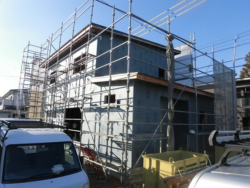 一時的に濡れてしまうのは仕方が無いにしても、雨に濡れてしまう状況を1週間も2週間も放置しておくのはやはり良くないので、2日目は耐力面材となる『EXハイパー』を張る作業を行うようにしています。