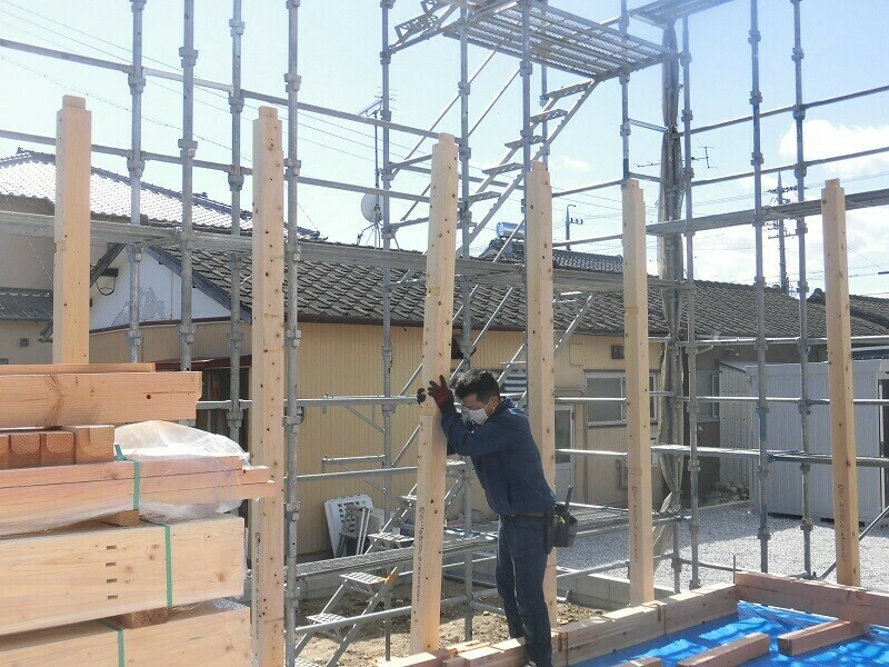 柱立てと言って、上棟日前日の天気が良ければ前もって1階分の梁を配り、柱を立てておく作業を済ませておきます。