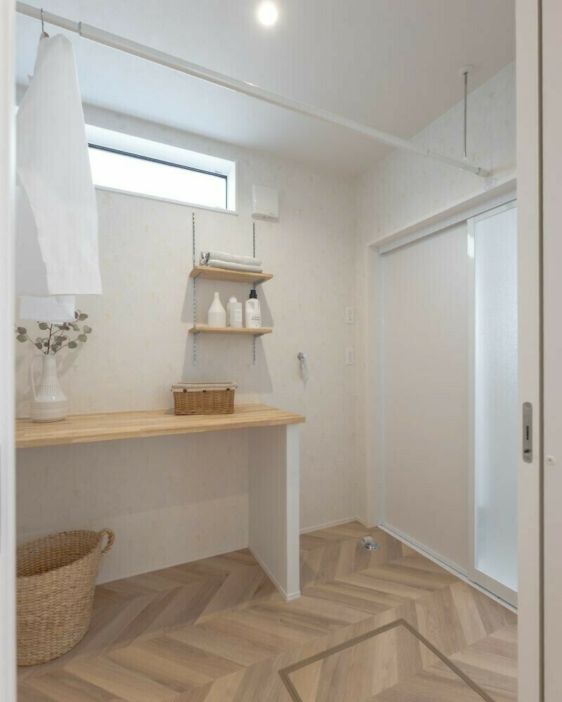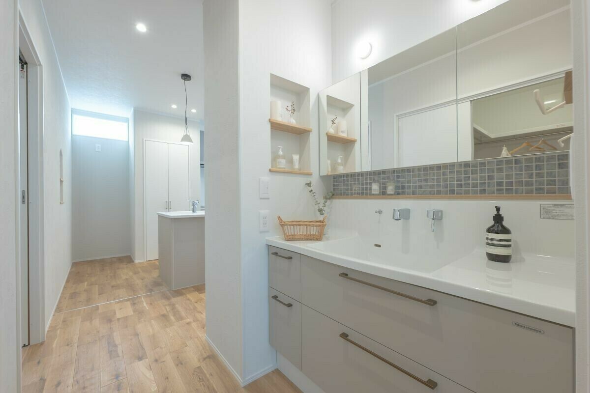洗面化粧台の色はキッチンと同色にしたので統一感が出てナチュラルな雰囲気が素敵です。