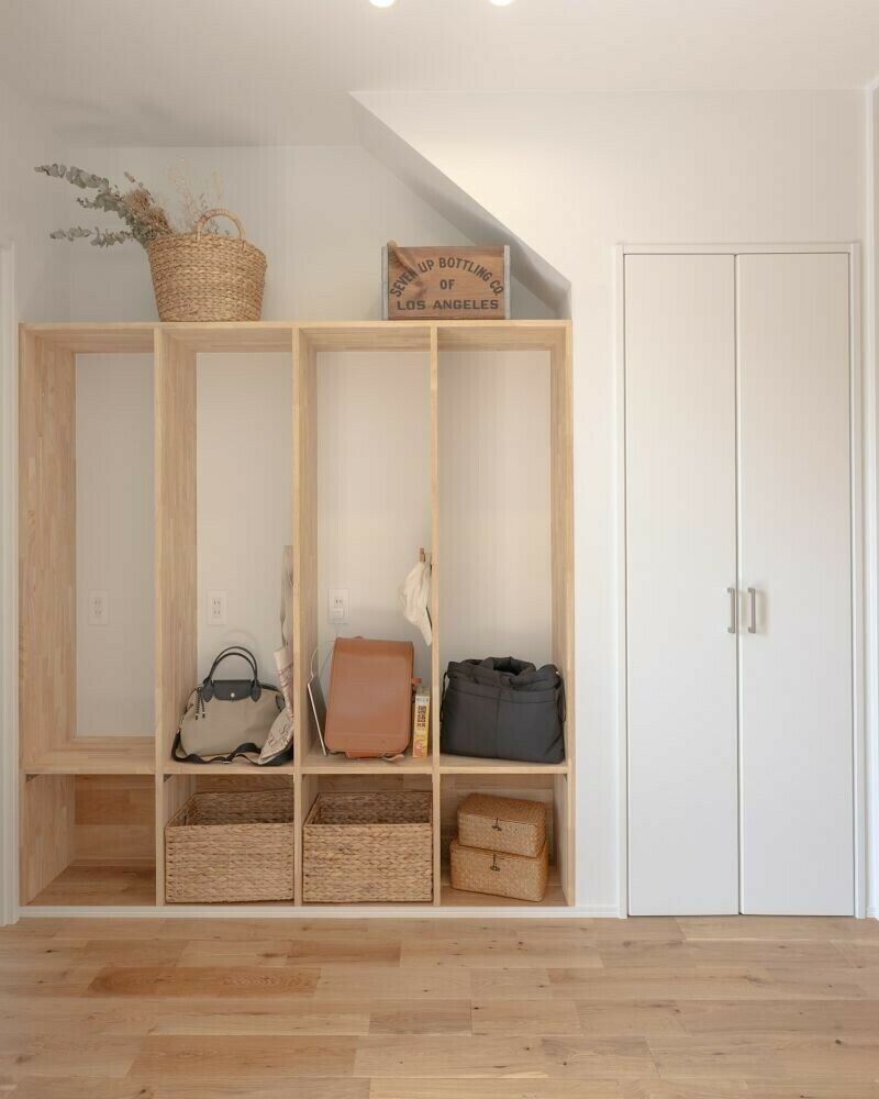 帰ってきたらまずしまう・片付けるを身に付けてもらうために1人1個のスペースにしています。