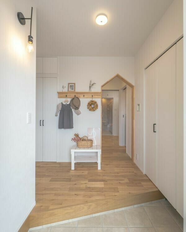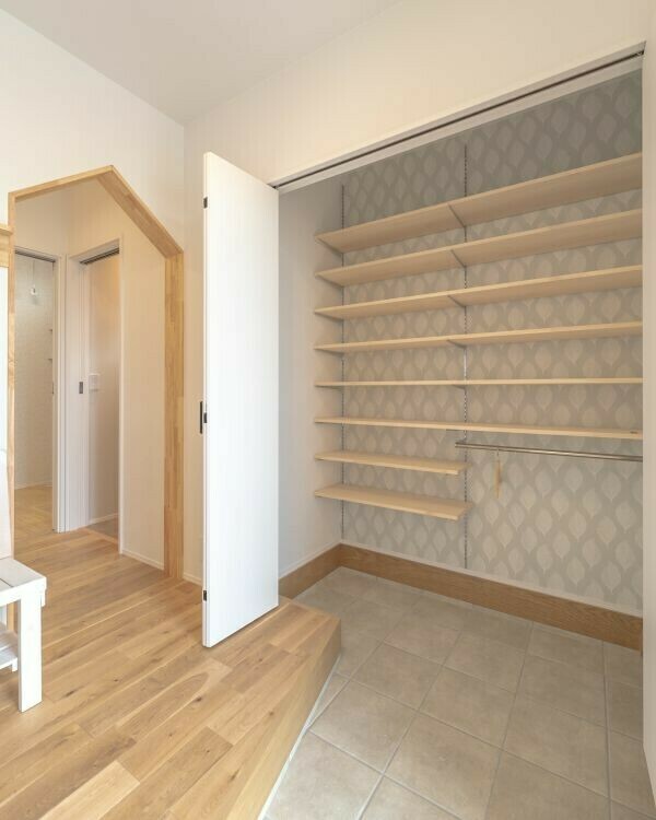 マッドルームとは、家に入る前に靴やコートなどを脱ぎ、整理整頓できる玄関クロークのようなスペースのことです💡