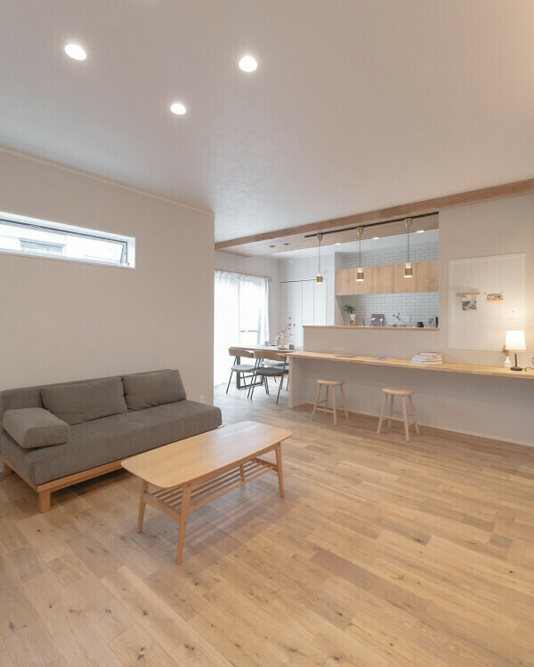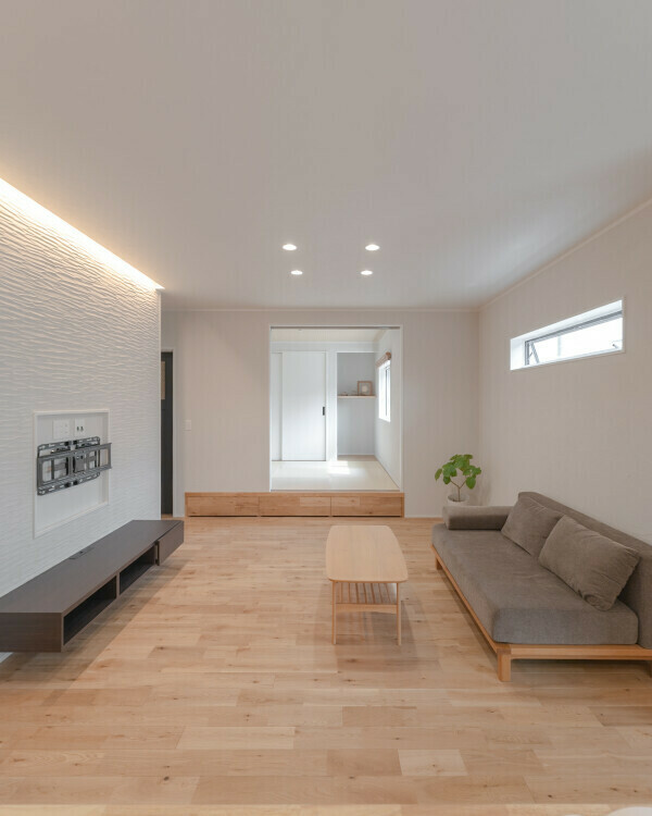 リビングは高窓からやさしい光を取り込み、外からの視線をそっと遮ってくれる。