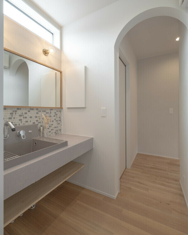 洗面化粧台は脱衣室の隣に配置しています。グレー基調のシンプルナチュラルなコーディネートです。
