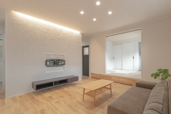 テレビの壁面だけシラス壁(塗り壁)の塗り方を変えました。天井からの間接照明の陰影が素敵です。