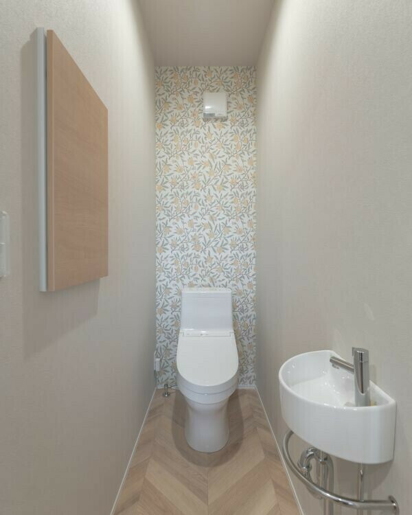 トイレのアクセントクロスには”ウィリアムモリス”をご採用。ナチュラルな風合いが素敵です。
