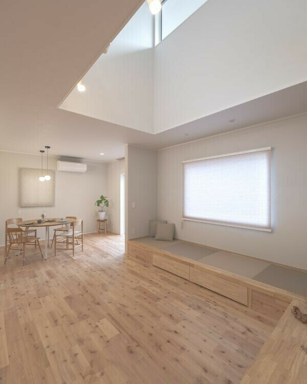 吹き抜けリビングの明るさと、動線の工夫を両立させた「ひなたで寛ぐ家」。