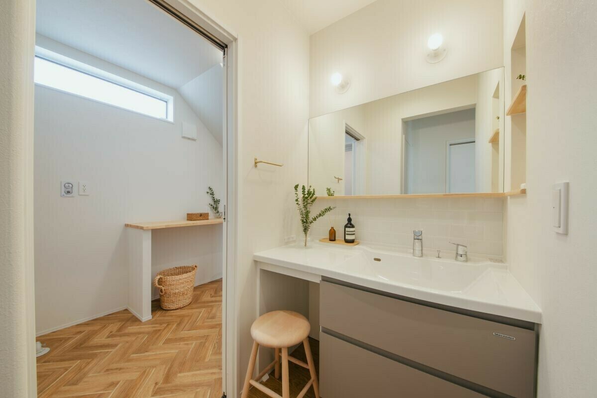 大人2人並べる、半造作の洗面台。洗面台から上部分はすべてオーダーメイドです。横の壁には歯ブラシ、化粧水など置けるニッチもあります。