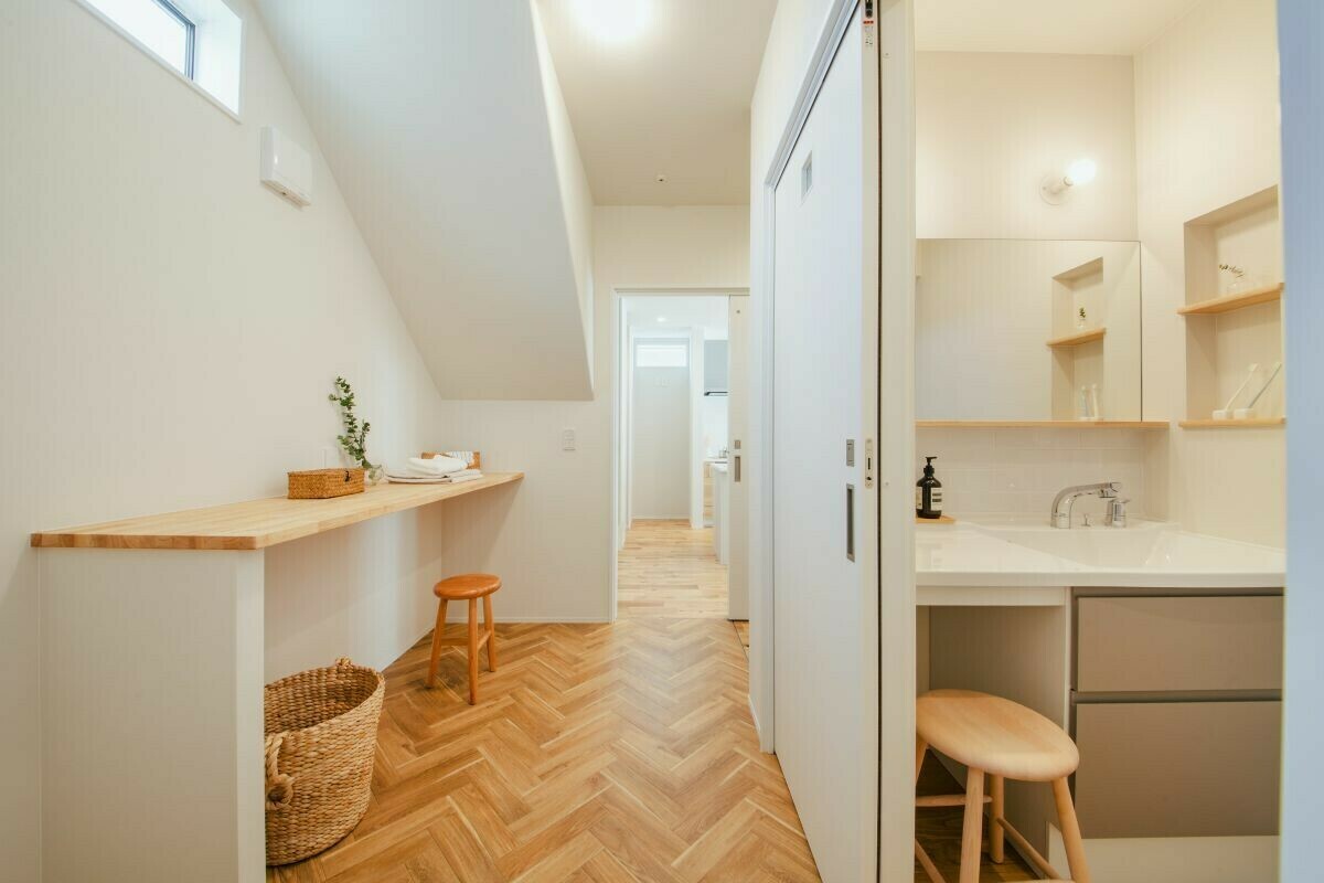 LDK&玄関方面からの2ルートで行ける脱衣室兼ランドリー室。奥側にはミニクローゼットがあり、毎日使う鞄や上着を収納するのに便利です。