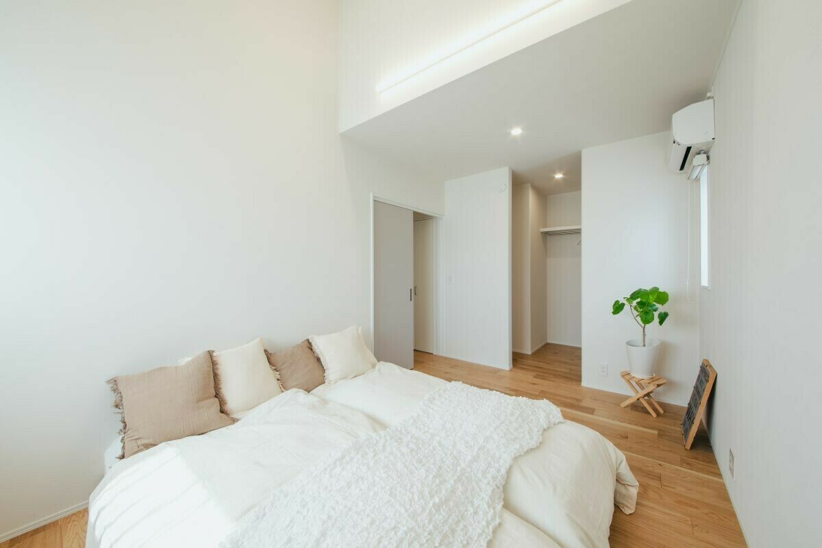勾配天井の開放的な心和らぐ寝室。より良い睡眠環境にすべく、壁の一面を空気浄化効果が期待されるシラス壁を施しています。