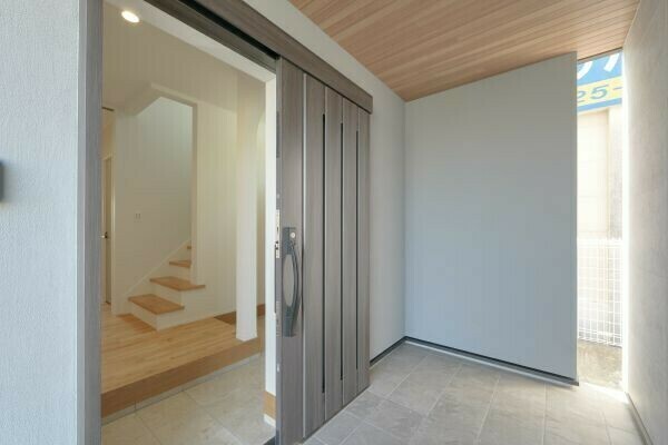 室内の無垢床と馴染むように玄関ポーチ部分の軒天には木目のデザインを取りました。