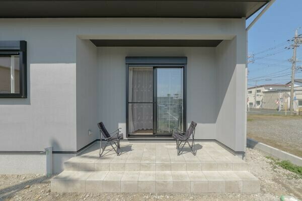 ウッドデッキではなく、外観デザインとの相性を考えてタイルデッキを採用しました。 庭でお子様が遊んでいる様子を見守ったり、椅子を置いてゆったり過ごしたり、暮らしの楽しみが広がる場所です🧺⛱️