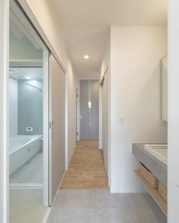 玄関ホールから一直線で洗面・脱衣室・物入と繋がっているので、帰宅後の動作もスムーズに。