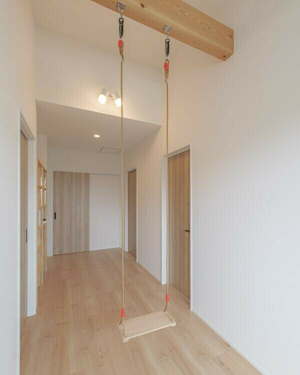 このホールには造作の本棚と梁を出してブランコを取り付けています♪