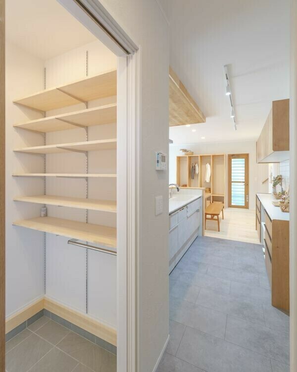 買い物から帰ったら、そのまま行けるパントリーは重たい荷物もスッとしまえて便利です📦
