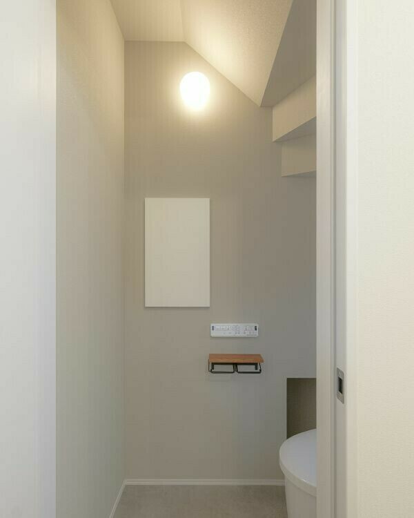 1Fトイレは省スペースを利用した階段下に。窓をつけることで閉塞感を和らげました。(階段下のデッドスペースを活かした収納スペースも◎)