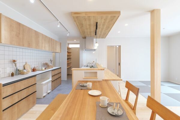 土間収納からパントリー、キッチン、脱衣室、洗面、そしてリビングへ。家の中をぐるっと回れるようにつながった間取りにしました。それぞれの空間を近くすることで、行き来しやすく毎日の動きをスムーズしてくれます。