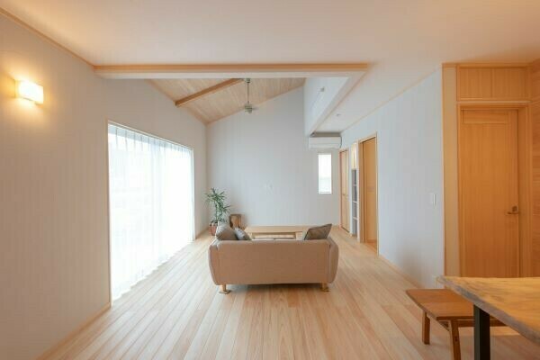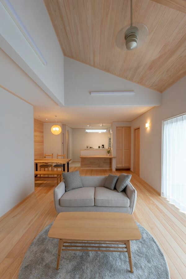 リビングに入った瞬間からヒノキのいい香りに包まれ、勾配天井から生まれる解放感と窓から入る光でのびのびと過ごすことができる大空間のLDKです。
