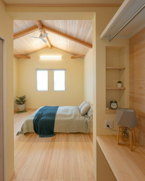 プラスして天井を屋根の形状に合わせた勾配天井としているため通常の高さよりはるかに高く開放感に溢れています。寝室手前にはクローゼットとカウンターを設けています。衣類を畳んだり、読み書きしたり、いろんな使い方ができるカウンターです😊