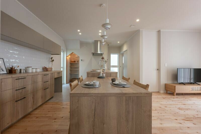 グラフテクトのキッチンは、天板(カウンタートップ)にまで木目が入っているのが特徴です。(普通は白ですよね)