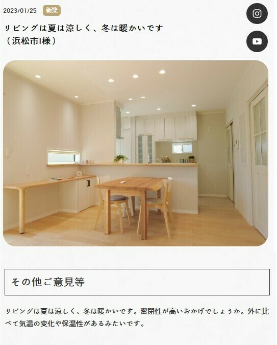 「リビングは夏は涼しく、冬は暖かいです。密閉性が高いおかげでしょうか。外に比べて気温の変化や保温性があるみたいです。」