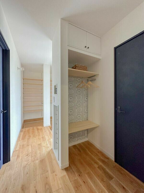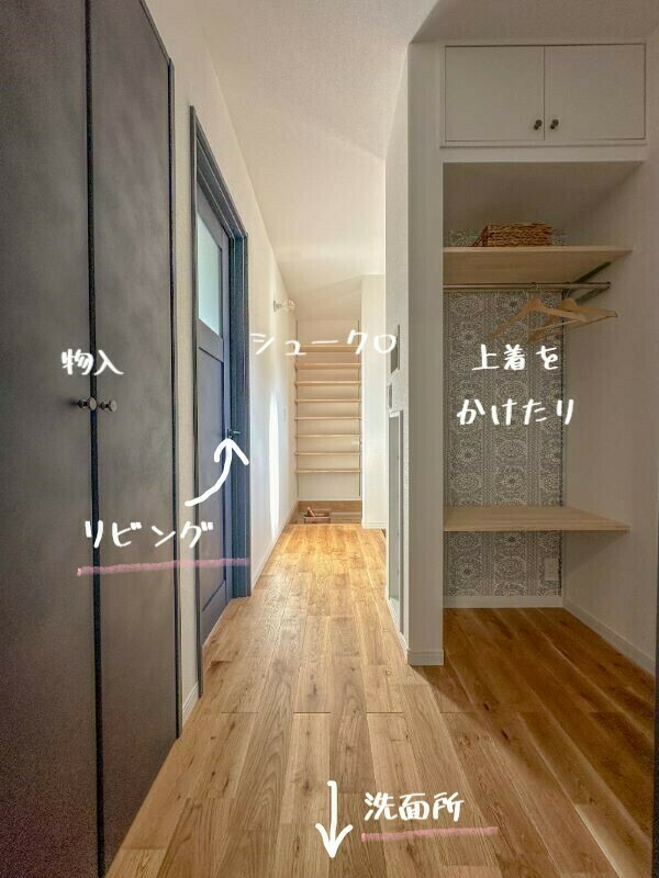 玄関から、洗面脱衣室→物干しルーム→キッチンへと続く動線。生活しやすく、洗濯→干す→しまうの工程がこの空間で完結できます。