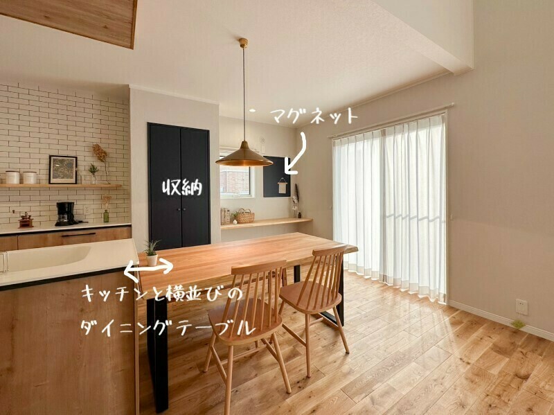 ダイニングテーブルはキッチンと横並びにすることで、料理を並べたり片付けたりがとてもラクチン。ほっと住まいるでも人気の間取り(配置?)です。