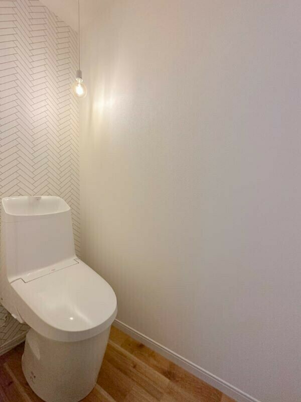 今回のモデルハウスは北欧テイストをベースにしていますので、トイレも北欧調のタイルクロスをアクセントにしました。照明は白のペンダントライトにすることで、外観のようなシンプルだけど洗練された空間をイメージしました。